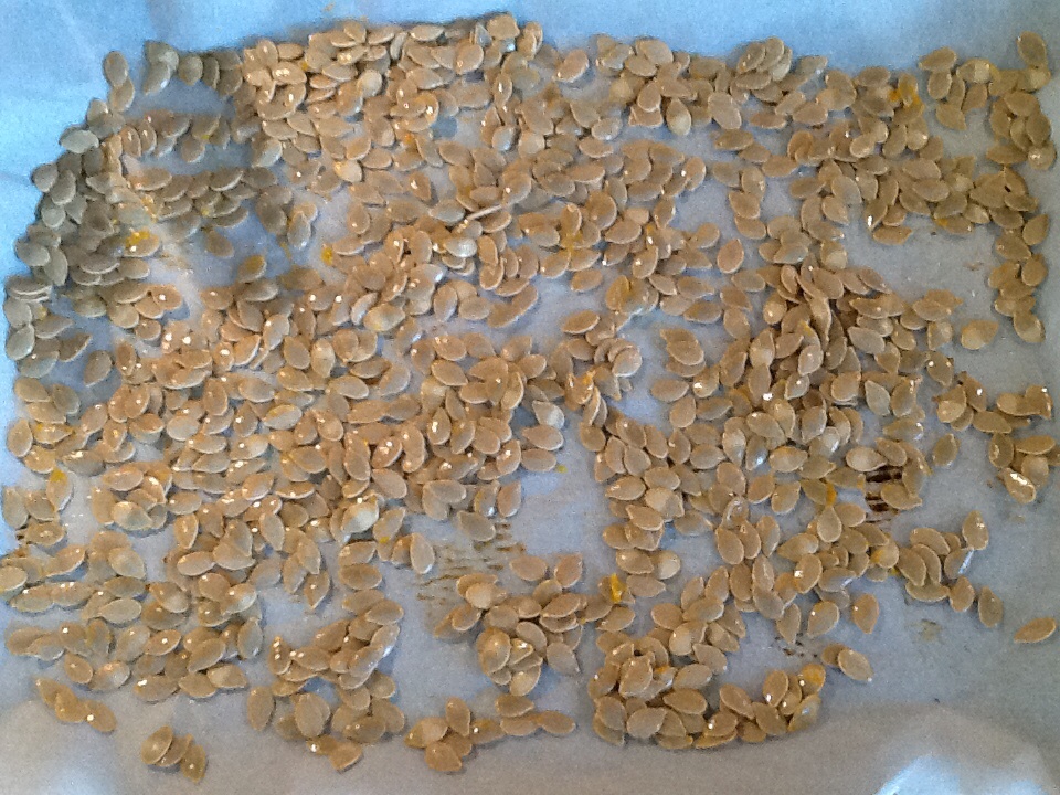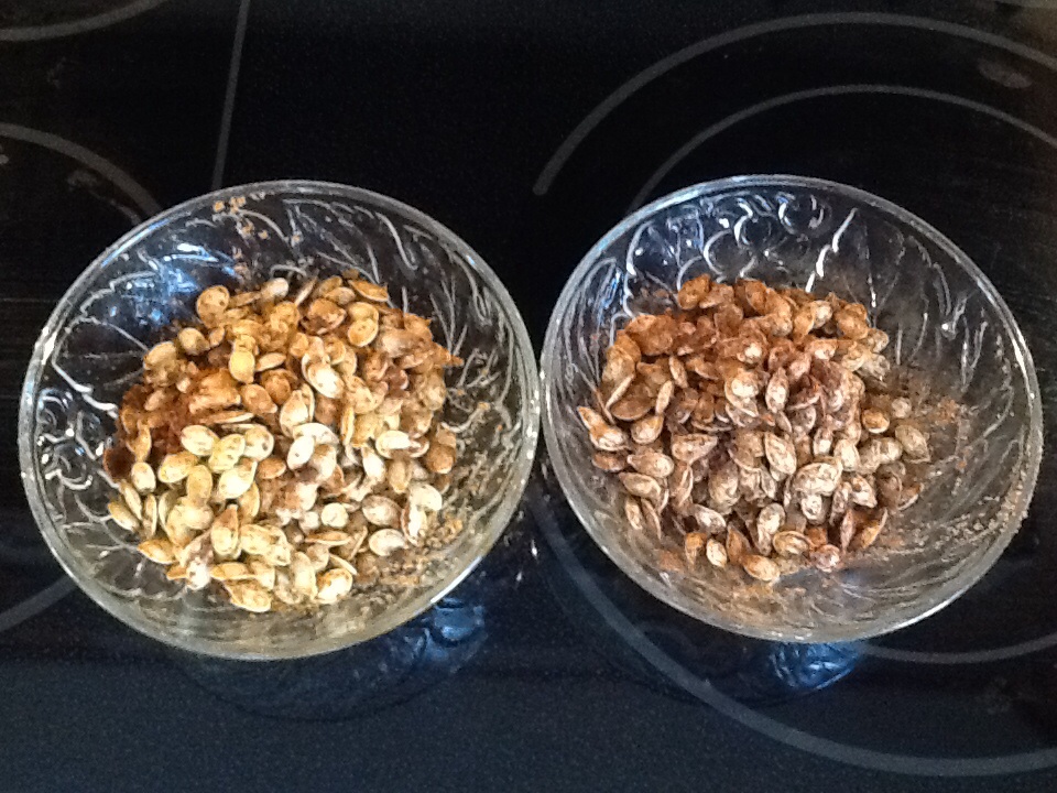 Being the “waste not” type of gal I am, I would always want to make those seeds into a tasty snack; but no matter how I roasted them, they would never crisp and crunch up like I imagined they should. What was I doing wrong?? It didn’t stop me from trying, but it’s so discouraging when you have romanticized about something just to be left with a soggy, tasteless, sticky mess. Is it appropriate to romanticize about roasting seeds? Anyway, it doesn’t matter, because now I know the secret…