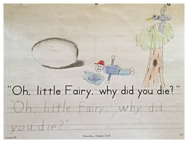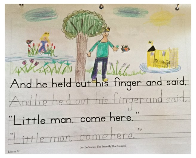 As the year progressed, we graduated to oral narration where I would copy and read it back to her. Like this (that’s my messy printing on the side, quickly copying word for word what she is saying)…