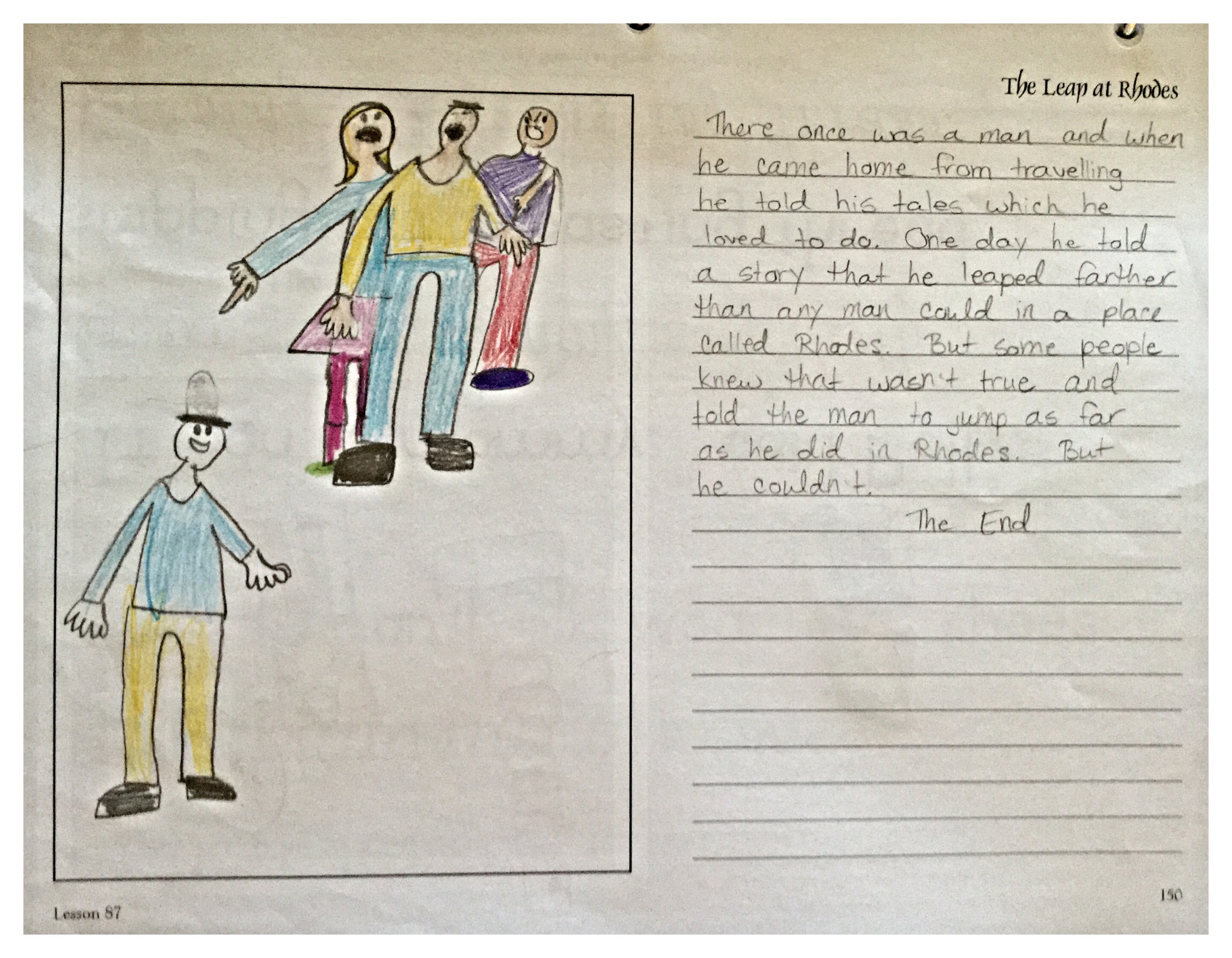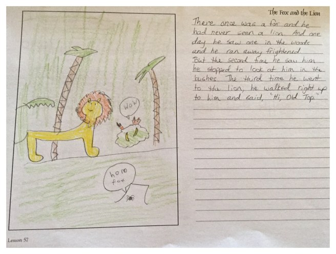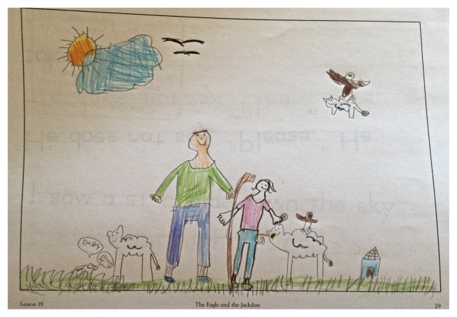 Narration exercises were scheduled once every two weeks, starting with picture narration at the beginning of the year where she would listen to me read a fable and then draw a picture to use in telling the story back to me. Like this…