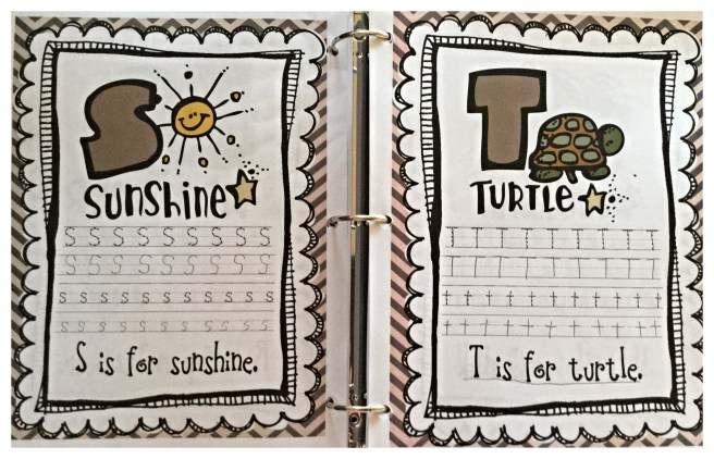 We started out with a review of upper and lowercase manuscript letters. This is something she had learned in Kindergarten, but I knew it would be a good review for her as she still tends to write a few of her letters backwards. I found these super cute alphabet handwriting practice pages by Rachelle at whattheteacherwants.blogspot.com.