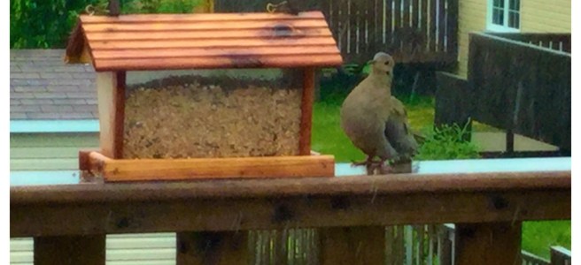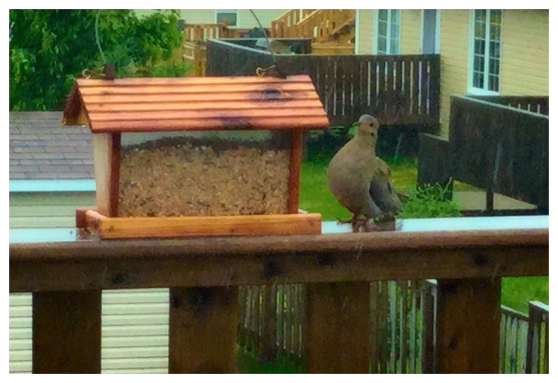 It rained and rained all day yesterday, making our end of the school year trip to a local amusement park impossible.  Needless to say, the girls were very disappointed so it was nice to have a fun distraction over what was supposed to be our picnic lunch in the sun!  Finally, after supper, the kids needed to get out of the house and stretch their legs.  They didn’t want to, but we knew they needed to!  So we all took the dog for a walk in the rain. On our way around the block, we noticed a pair of mourning doves sitting on the wires overhead and wondered if one of them might have been the one dining on our deck earlier that day.  There are lots in our neighborhood.  Even as I type this, I can hear one cooing outside somewhere this morning.