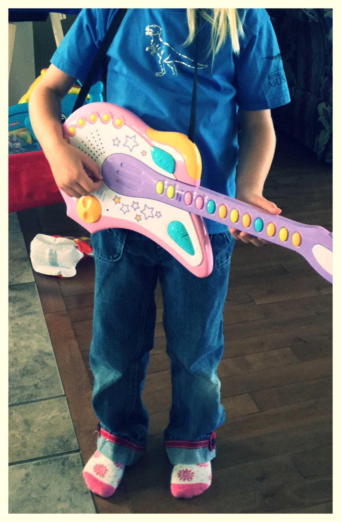 Belle and I escaped the germs today for a few hours and spent some time shopping around town.  I am not a shopper, but I do have to admit it was a delight to spend the time with her, unhurriedly browsing together.  She was beyond excited to find a toy guitar at a local thrift shop.  She has been begging for one for weeks.  I am thinking I may regret this purchase (we are not usually fans of battery operated toys), but already it has brought hours of entertainment to both her and Little Mister, both of whom have music in their bones!  Not bad for $3.