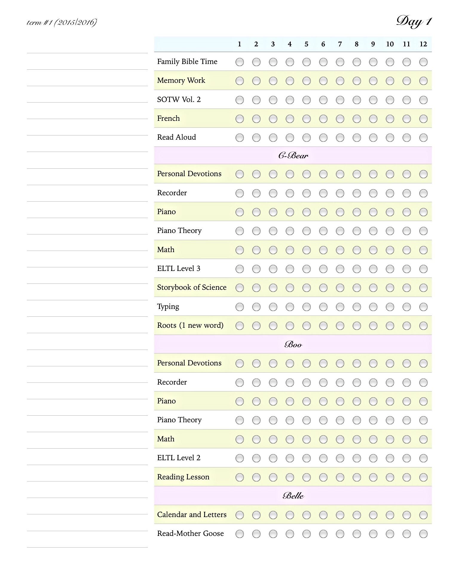 I’ve been taking advantage of our home-bound time this week to lay out our schedule for the fall.  Last year I could fit the whole week’s checklist on a two page spread, but with adding some new subjects for C-Bear and with Belle starting Kindergarten, I am needing a whole page for each day!  Here’s a sample of what I’ve come up with so far for Day 1 (which in our case is usually Monday)…