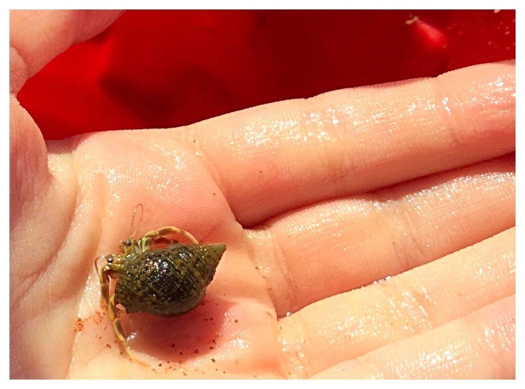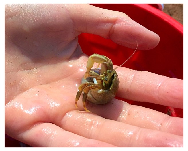 Today we watched hermit crabs of various sizes scoot around in their shells of all shapes. We accidentally separated one from his home while holding him up for the camera, but then we saved the day by returning him and his shell back to the water and watching while he zipped back in in a flash.
