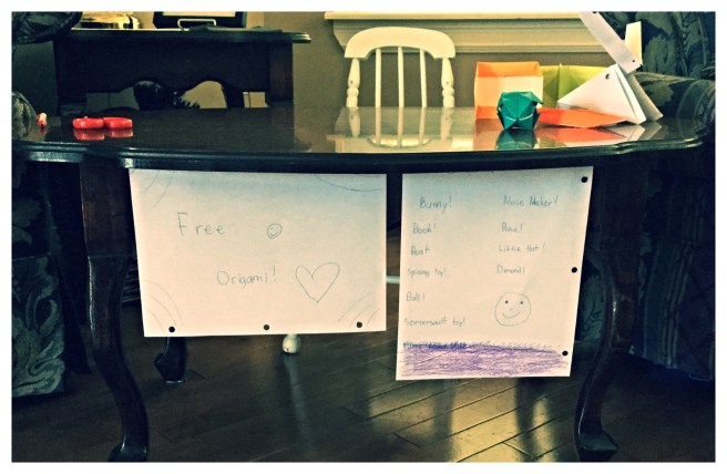 It seems C-Bear has taken quite an interest in paper folding this summer. Our tables, floors, and countertops are littered with origami creations. New paper projects keep popping up on the coffee table, the dining room table, my bedside table.