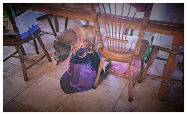 I’m listening and watching; and, in a way, they are unknowingly narrating for me as they play. Belle lives with her baby prairie dog, Little Mister, in a burrow in the dining room (under the table), and Boo lives in her burrow in the livingroom (behind the love seat). They come out to eat grass, get very excited at the prospect of rain (since it’s very dry where they live), and are ever on the lookout for owls and rattlesnakes. Boo even has pillows set up as her mound at the entrance to her den (ie. a look-out tower), and she has put a blanket at the bottom of her burrow to act as the soft grass for her bed. There’s lots of socialization going on in this prairie dog “town”! Their dialogue is absolutely cracking me up. I cannot get over the details they are remembering from our reading. Belle says, “Oh, a puddle of water. Let’s have a drink.” Boo exclaims, “But we don’t need to drink water. We get water from the grass we eat!” This game is doing my heart good! Learning can be FUN!