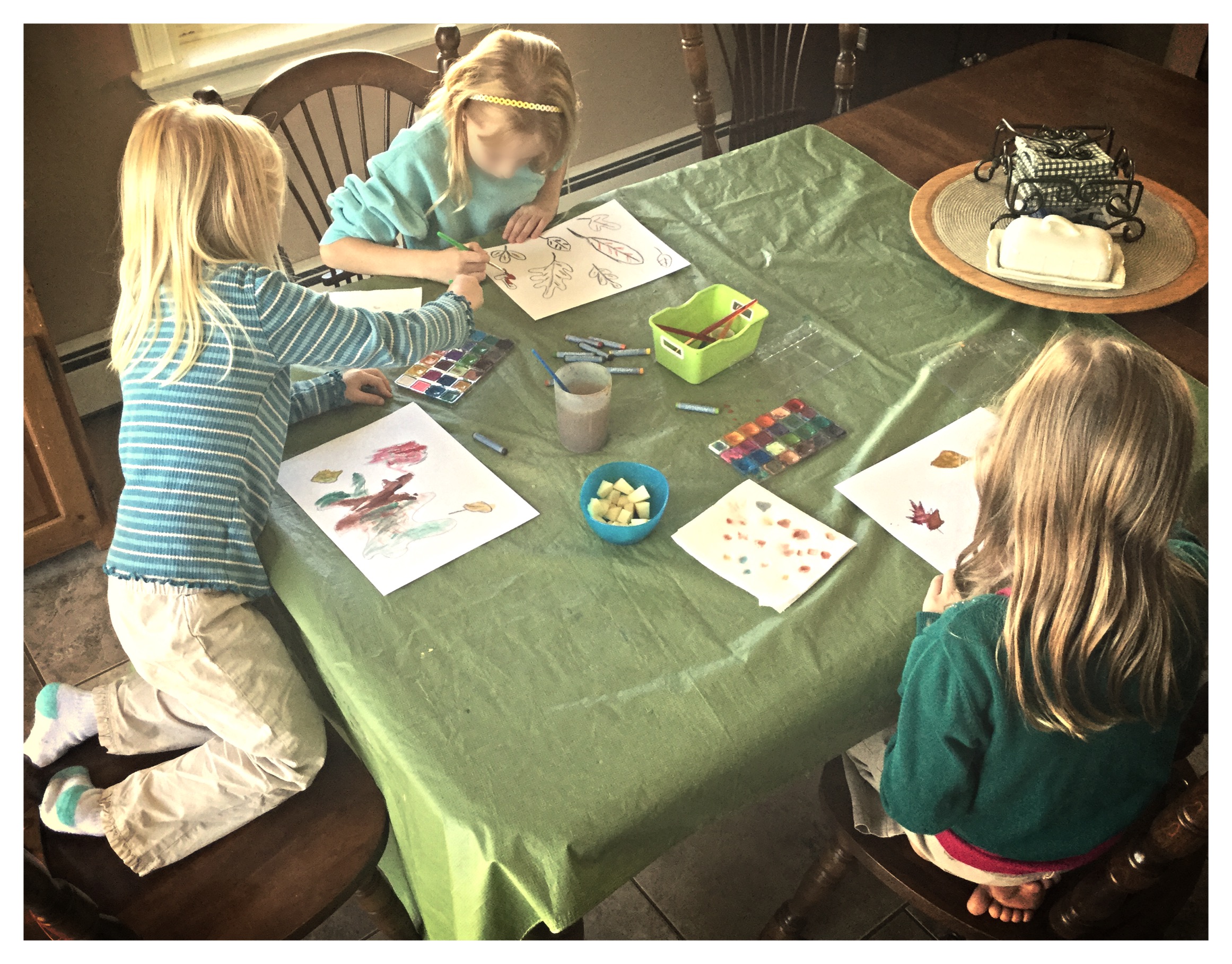 Thursday was a smoother schooling experience for all. The kids always look forward to our art lesson on Thursdays so perhaps that kept them in a more cooperative mood that morning. Here’s a peek at this week’s project…watercolour fall leaves. There is a great instructional video here for this project. Boo was so cute as she commented on how neat it was that the pastels “resisted” the watercolour paint. I had to smile. That’s exactly what it’s called (watercolour resist technique), but I’m still not sure where she would have heard that terminology before. Leave it to Boo – she would only have to hear it said once to remember it.imageimage