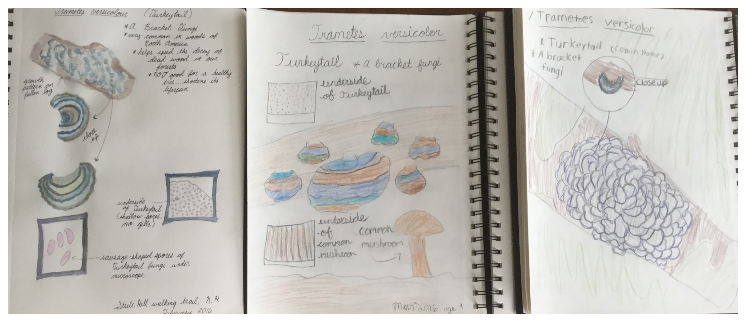 Turns out it’s Trametes versicolor, one of the most common fungi in our North American woods. The girls got a kick out of its common name – turkeytail. We talked about the role of fungus in general in breaking down deadwood in our forests. We talked about whether mushrooms were even plants since they contain no chlorophyll and are incapable of photosynthesis. We also talked about how dangerous fungi are to healthy, living trees (despite their benefit to dead trees) and how we should never recklessly hack away at the bark of a healthy tree because we might open it up to infection by spores, shortening the tree’s lifespan. Anyway, back to these gorgeous turkeytails. The ones we saw were blues and browns and creams, but when we searched for images online we found out they come in just about any colour variation you can imagine. We were also surprised to learn that this type of fungus has shown cancer fighting properties.
