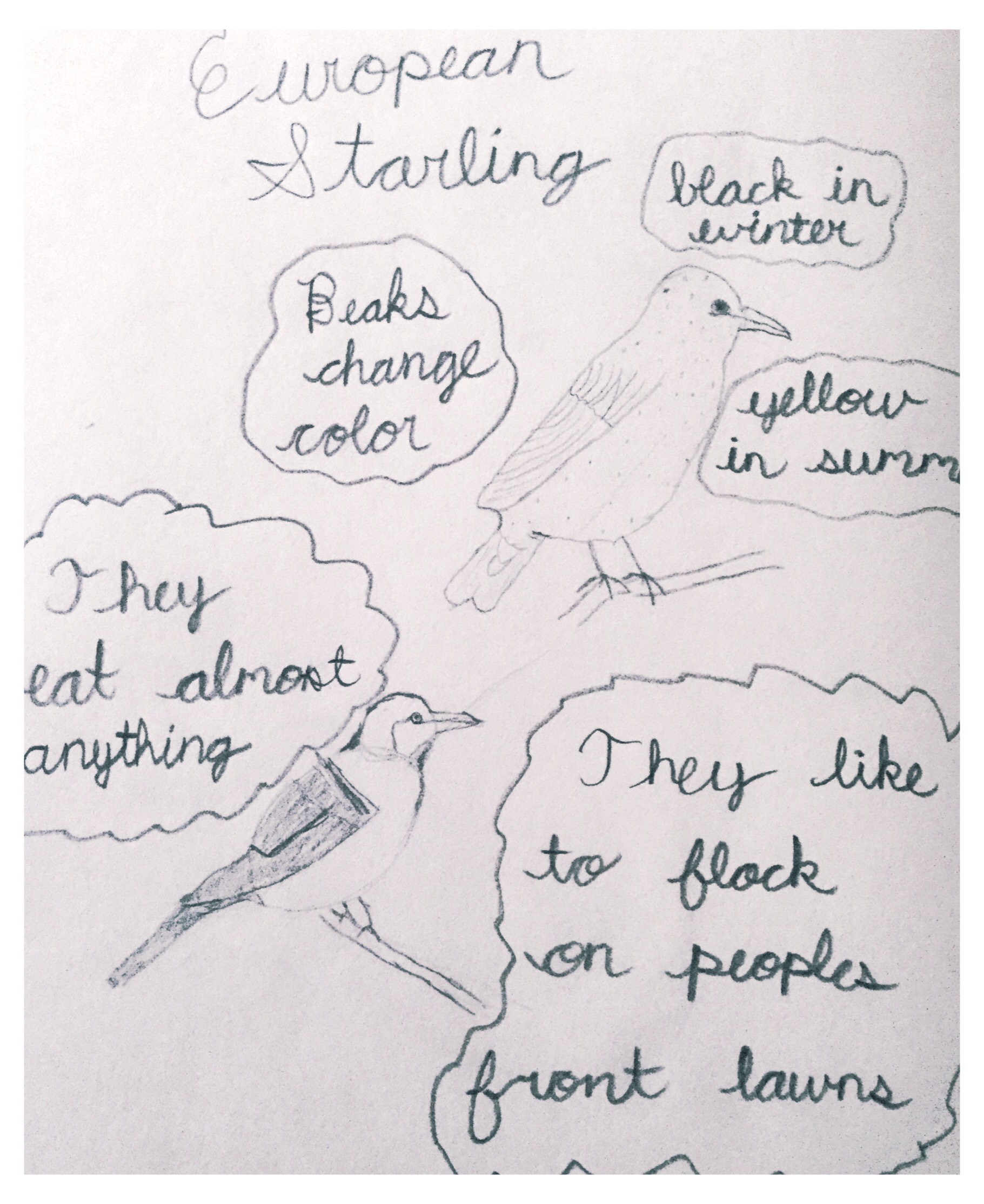 Then last evening as I was doing a bit of research for our nature study today on the European Starling (a frequent visitor to our bird feeder), I remembered this downloaded booklet. Then I found this great YouTube video where one of the authors of the aforementioned curriculum walks you through the step by step process of drawing a bird and what to make special note of. The video is twelve minutes long or so and some of it was over our heads, but I thought there were enough simple tips to make it worthwhile watching with the kids. I’m so glad I did! We followed along, sketching in our nature journals as he did in his, and I’m amazed at the results. I mean, I’ve tried to draw birds before, and I’ve seen birds that my kids have drawn, but these sketches are the best by far in our repertoire! I’m excited to apply these principles to other birds we see around our yard!