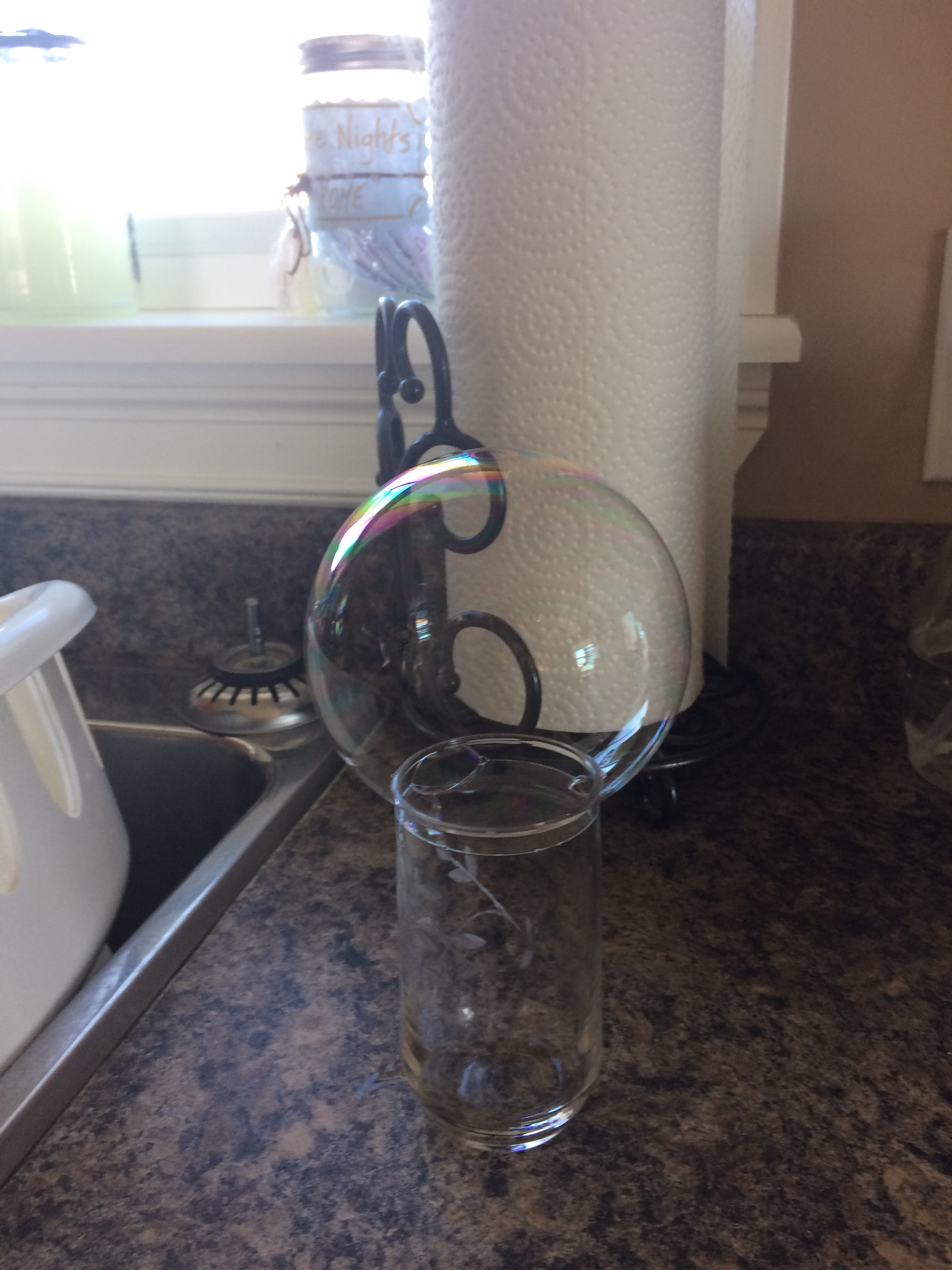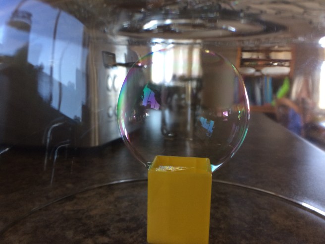 Boo had another experiment from her Drop of Water book this week. We blew bubbles and “caught” them to examine them and watch them grow thinner and thinner and then pop. As per the instructions I was wetting the rim of a small glass with the bubble solution. We caught a bubble (after a few burst attempts spalattered on our faces), and I tried to put the dome of our cake plate over top to protect it so we could examine it, but it was too high. I didn’t have a lower glass so Boo has the idea to use one of her square plastic blocks. I’m thinking this won’t work, but we give it a try and what d’ya know. The bubble sat on the block under the dome quite nicely. The dancing rainbows of bubble film are really a beautiful sight!