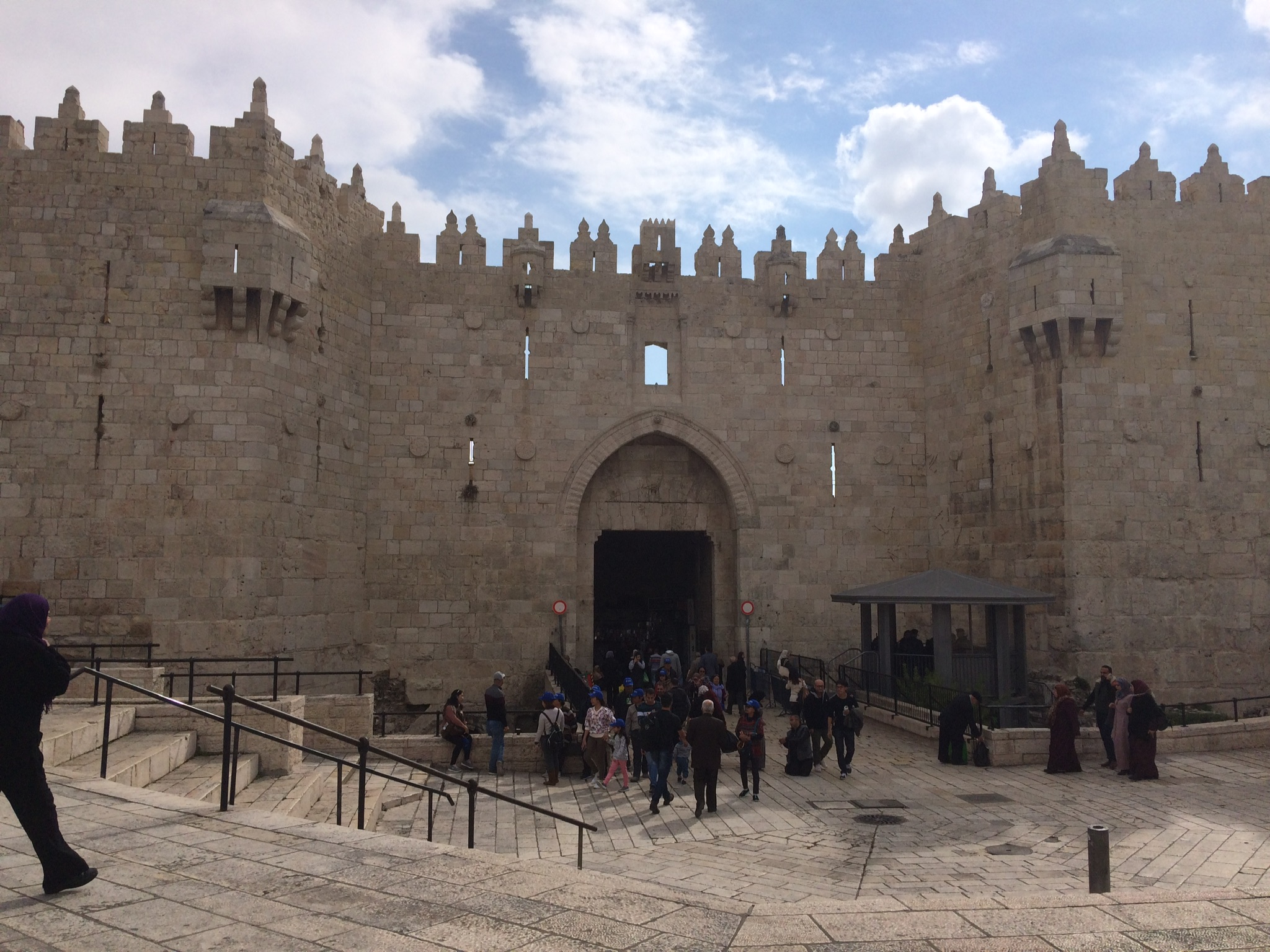 Finally I see the Damascus Gate. I now know where I am, and my belly is telling me it’s time for lunch. Exiting the gate, I climb the steps that form a sort of amphitheatre outside. I perch on one of those steps to eat my sandwich. Others have done the same. Facing back toward the Old City, I can watch people coming and going. Just outside the gate a man sits begging. He is a double leg amputee, and I get the feeling that this is his regular spot. The Israeli police officers in the nearby guard booth seem to know him.
