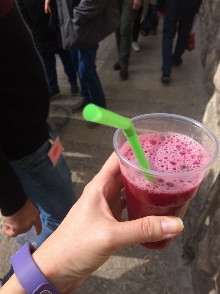 I have no idea where I am or how to get back to anywhere that’s familiar to me. I start walking, still feeling the need to keep moving after my fright up on the ramparts. There is safety in numbers, and that’s all that matters to me in this moment — staying in crowded places. Eventually I find my way back to the Christian quarter and spy one of the many shops that sell freshly squeezed pomegranate juice. I have been craving one ever since landing in Israel two weeks ago. I enter and watch as the shopkeeper pulls down a huge metal handle, squishing the purply red blood out of the pomegranate seeds. It spurts into my cup, filling it to the brim. I pay, emerging from his shop with delight, determined to savour all that is sweet and good about this day, a day that could have turned so sour a few minutes before. Holding my drink in one hand, I fish out my phone and snap a picture of my yummy drink, all the while keeping pace with the throng of people moving along the crowded streets of the market.