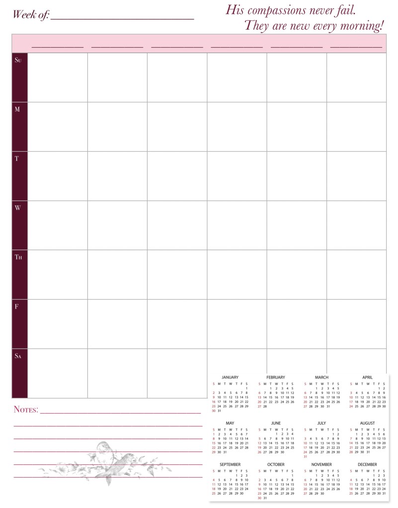 Finally I found a free moment to update the weekly family calendar for 2022! Our family is in the process of an interprovincial move…made even less fun by the biggest snow storm of the season, not to mention covid regulations and restrictions! Anyway, here you have it — a great calendar for putting up on the fridge (or some other visible spot) each week. Keep track of each family member’s appointments. Make a note of urgent “to do’s” in the Notes section. There is even a 2022 whole year at a glance calendar. I designed this for our family of six, but you could easily use any unused columns for that week’s meals, etc. if you don’t have six names to put across the top! Download it here.
