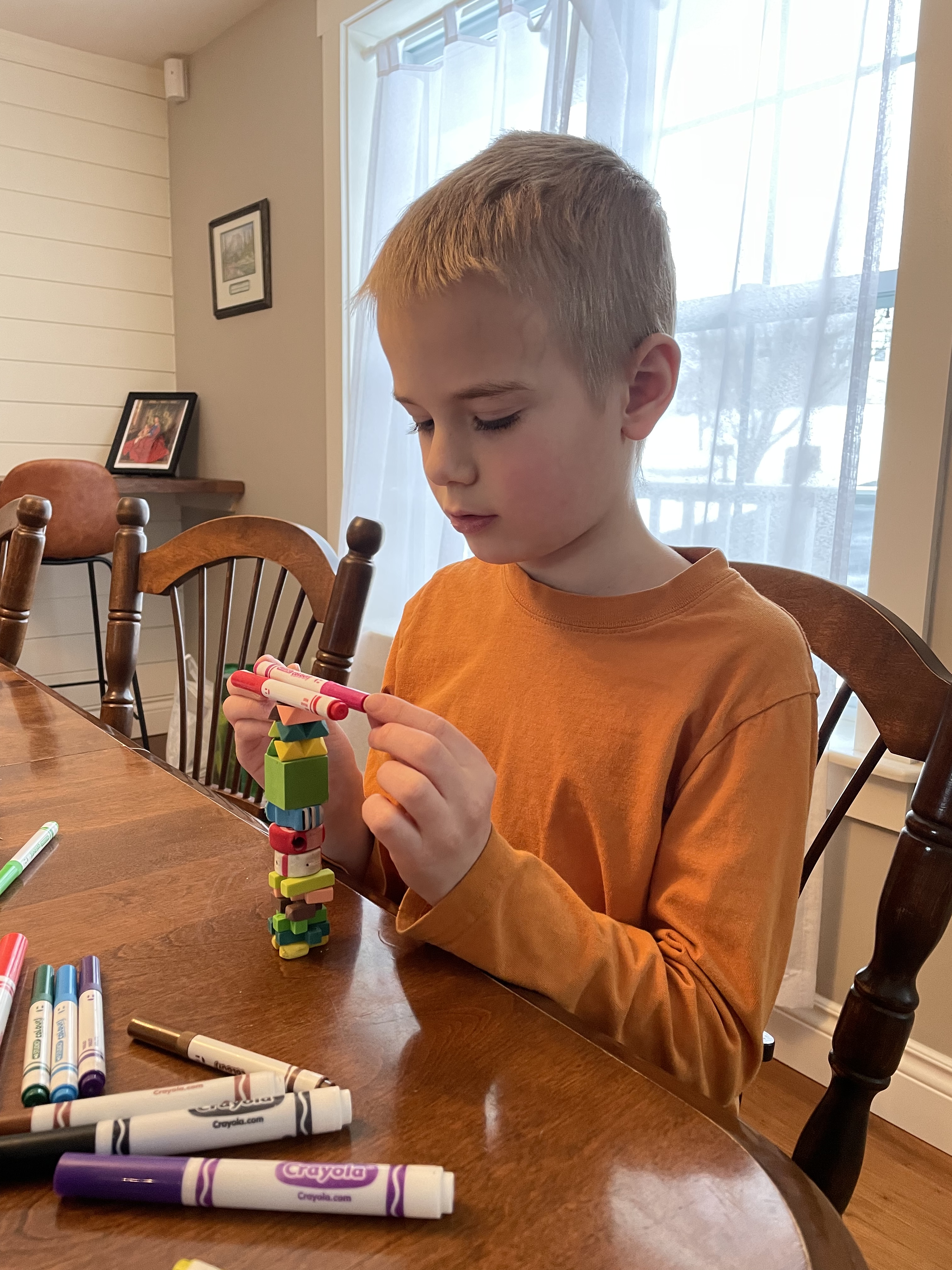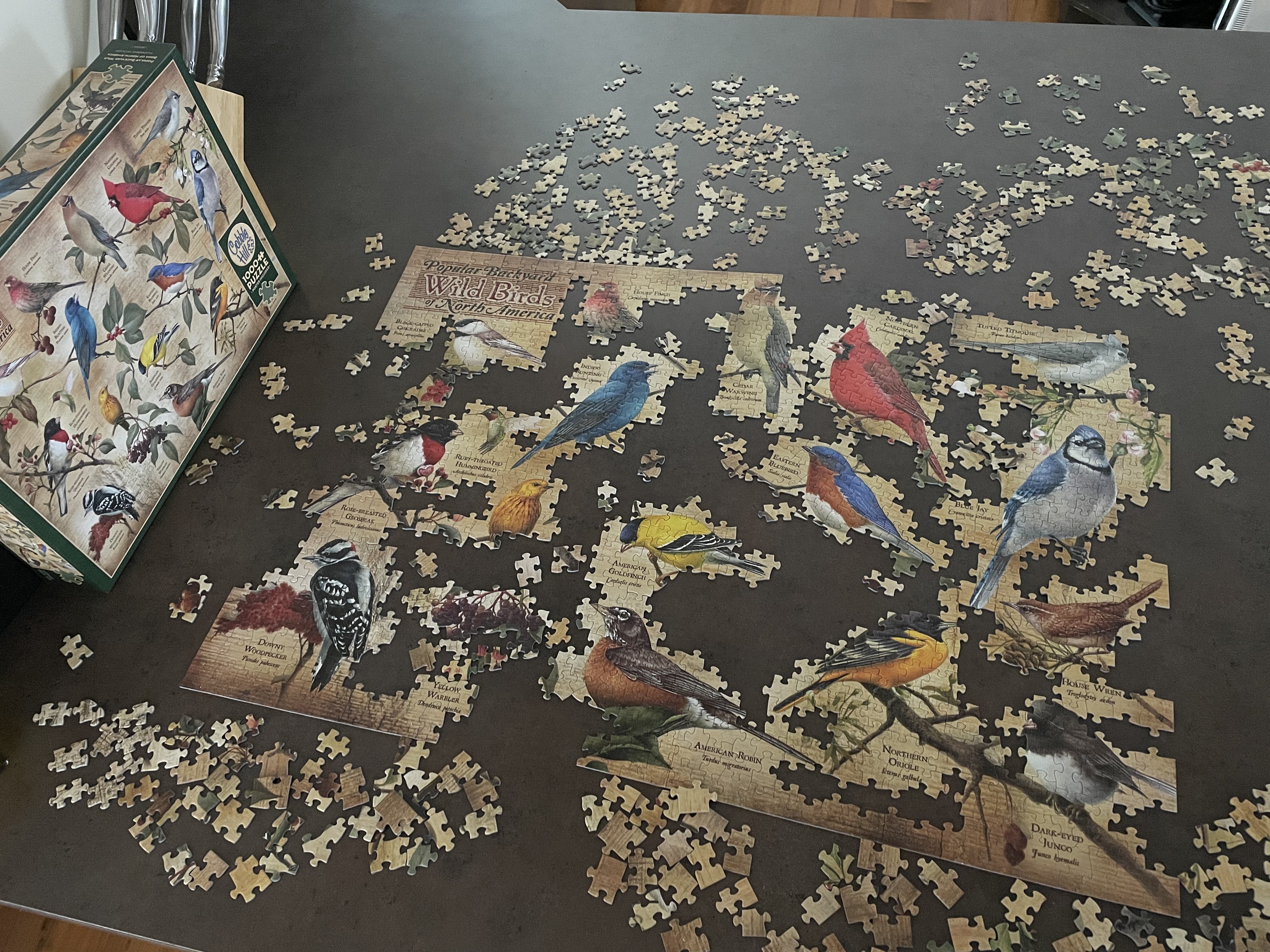 Speaking of animals, we found the perfect piece of counter space in our new house for working on puzzles. What does that have to do with animals? Well, our “Christmas” puzzle this year was a backyard birds one, and we never did break it open over the holidays. But this was the week that we finally tackled it. What a fantastic way to learn some common backyard birds. Anyone who has worked on this puzzle will forever be able to identify a Tufted Titmouse or a Cedar Waxwing I think. It would be a beautiful one to frame! I chose this puzzle because I am focussing on birds with Little Mister all year this year, reading from the Burgess Bird Book, among other things.